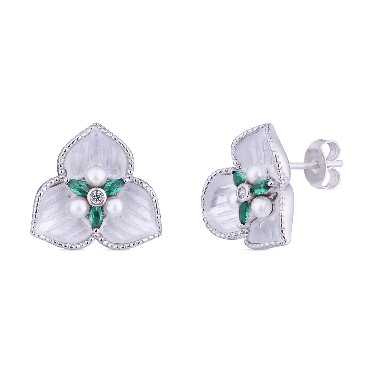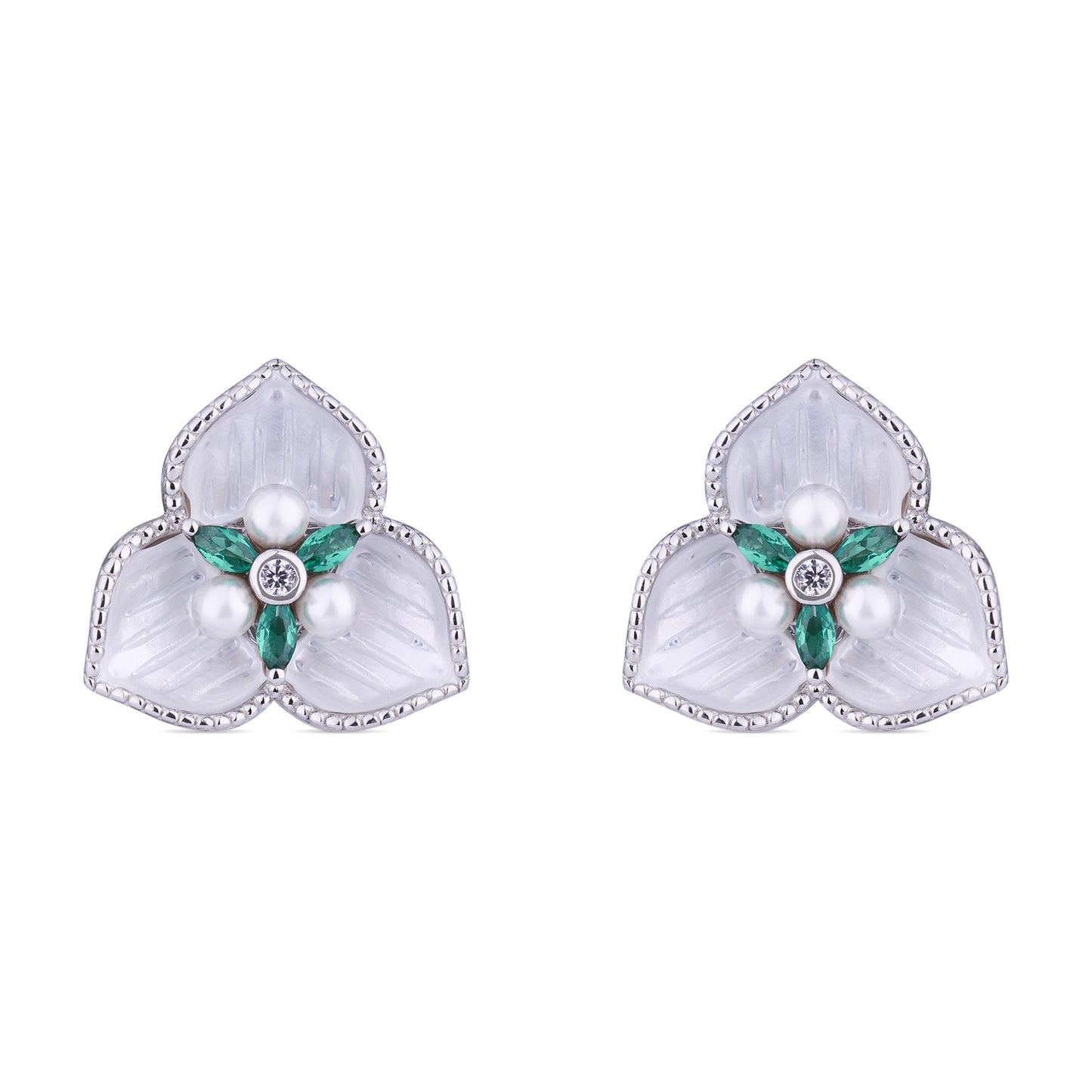 Soft ivory petals form a sculpted floral silhouette, accented with luminous pearls and emerald-toned marquise stones at the center. Crafted in 925 sterling silver with delicate textural edging, the design blends gentle sheen with refined structure. Elegant yet understated, these studs offer a graceful presence suited for both everyday and occasion wear.