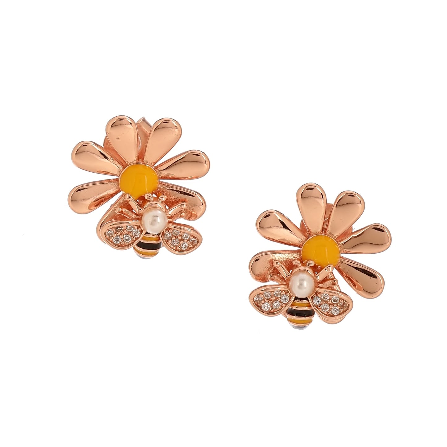 Rose gold studs shaped like open daisy flowers with a yellow centre and a small bee motif at the base, finished with pearl and CZ touches. A compact, playful design that adds character and detail while staying easy to wear.