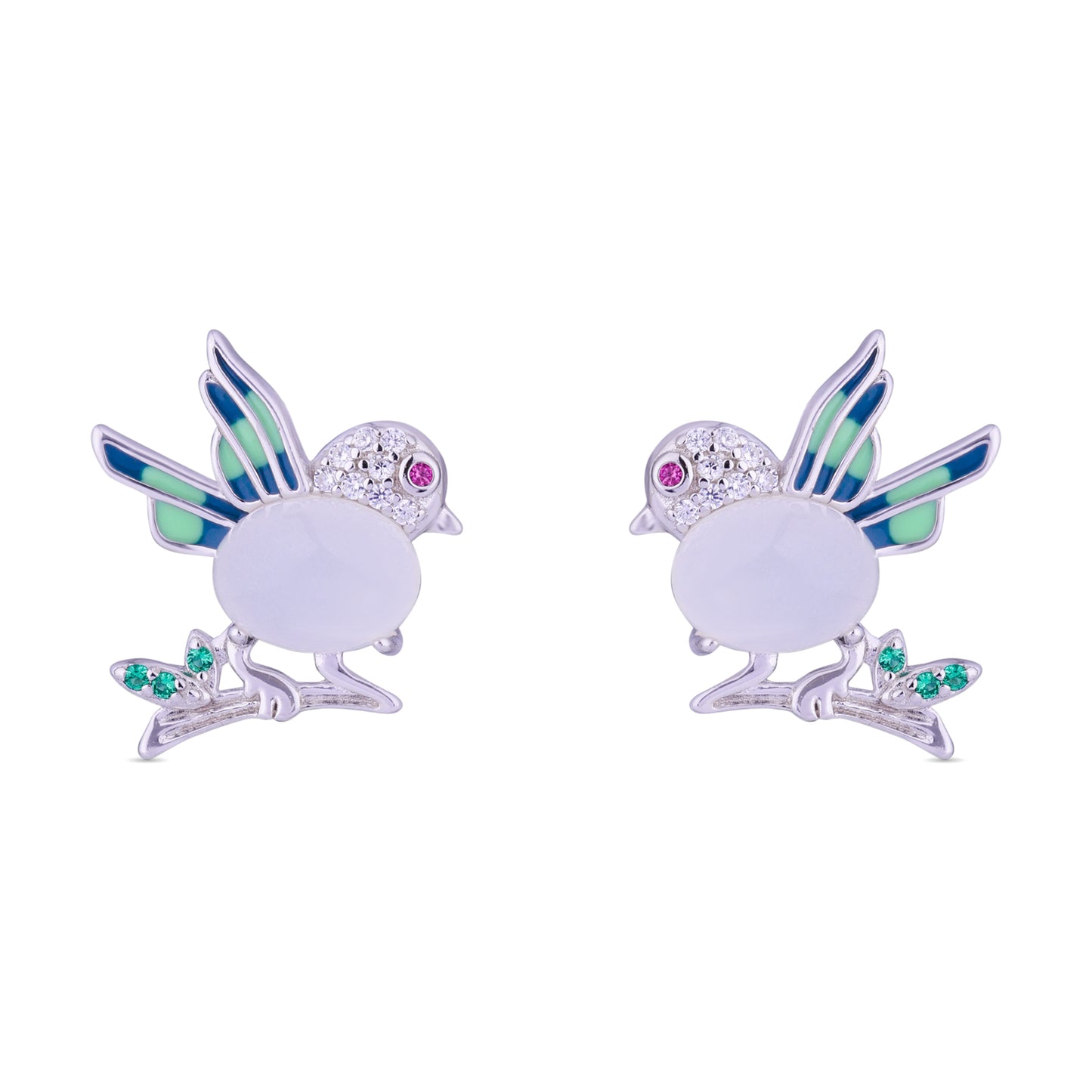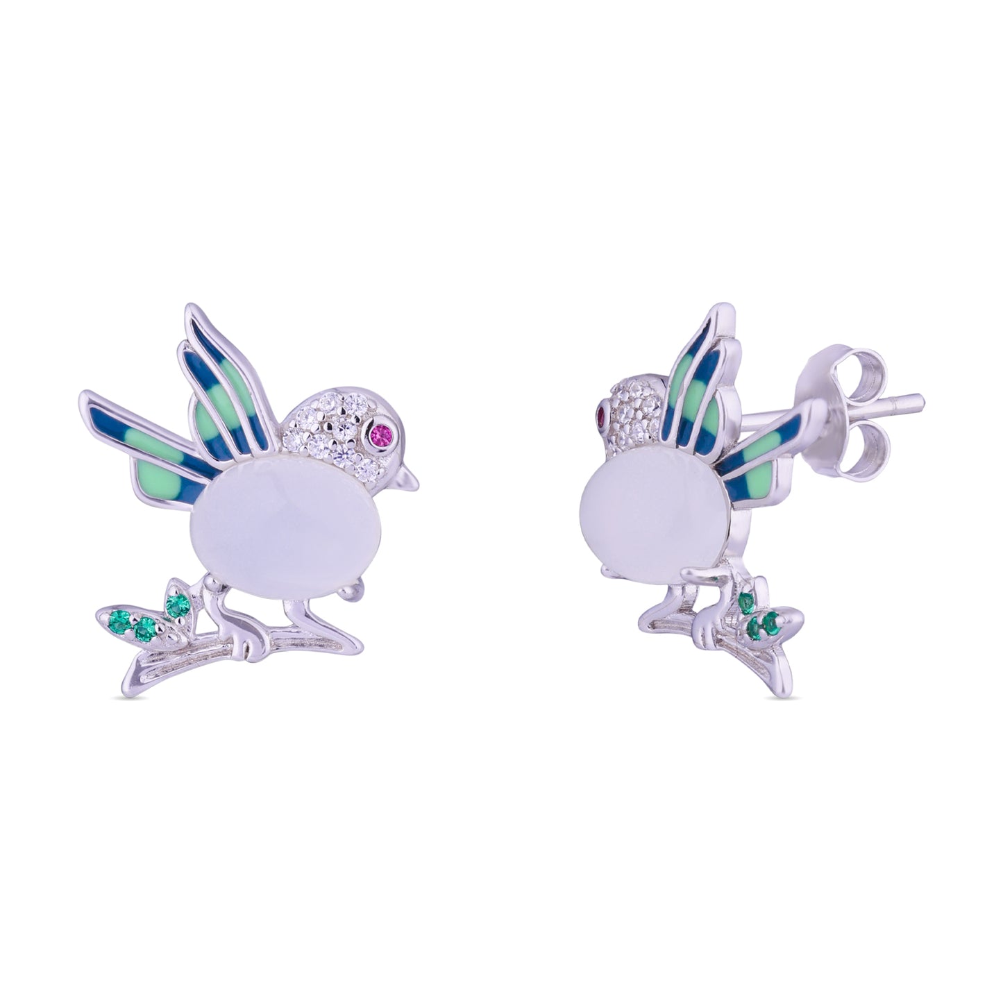 A charming silver songbird silhouette is crafted in 925 sterling silver, highlighted with soft mint enamel wings and delicate crystal detailing along the head. A smooth oval center creates gentle contrast, while subtle green accents at the base add a fresh touch of color. Playful yet refined, these studs bring lightness and personality to everyday styling. Available in silver and rose gold finish.