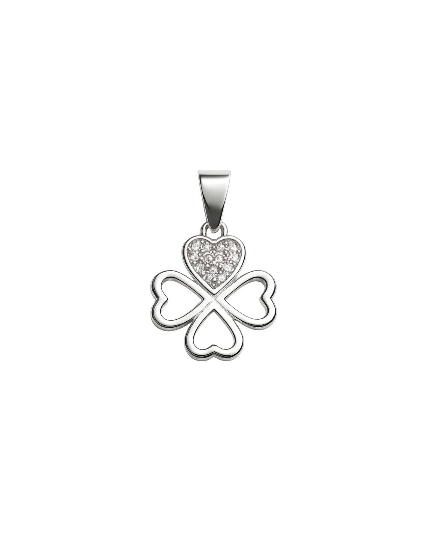 A four-leaf clover pendant in 925 silver with heart-shaped leaves. The top leaf is set with stones while the others remain polished outlines.