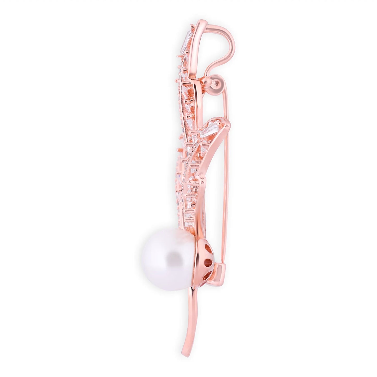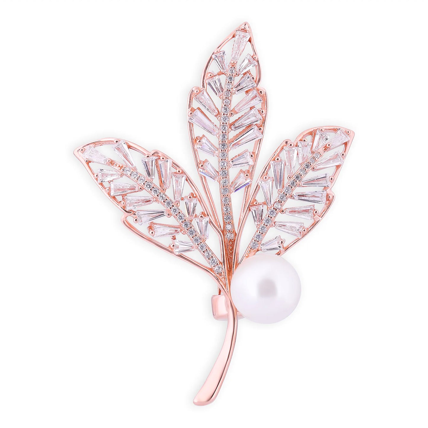 A rose-gold pin crafted as a three-leaf cluster with baguette-cut clear stones forming each leaf and a white pearl at the stem. The angular stones create a linear, structured profile.