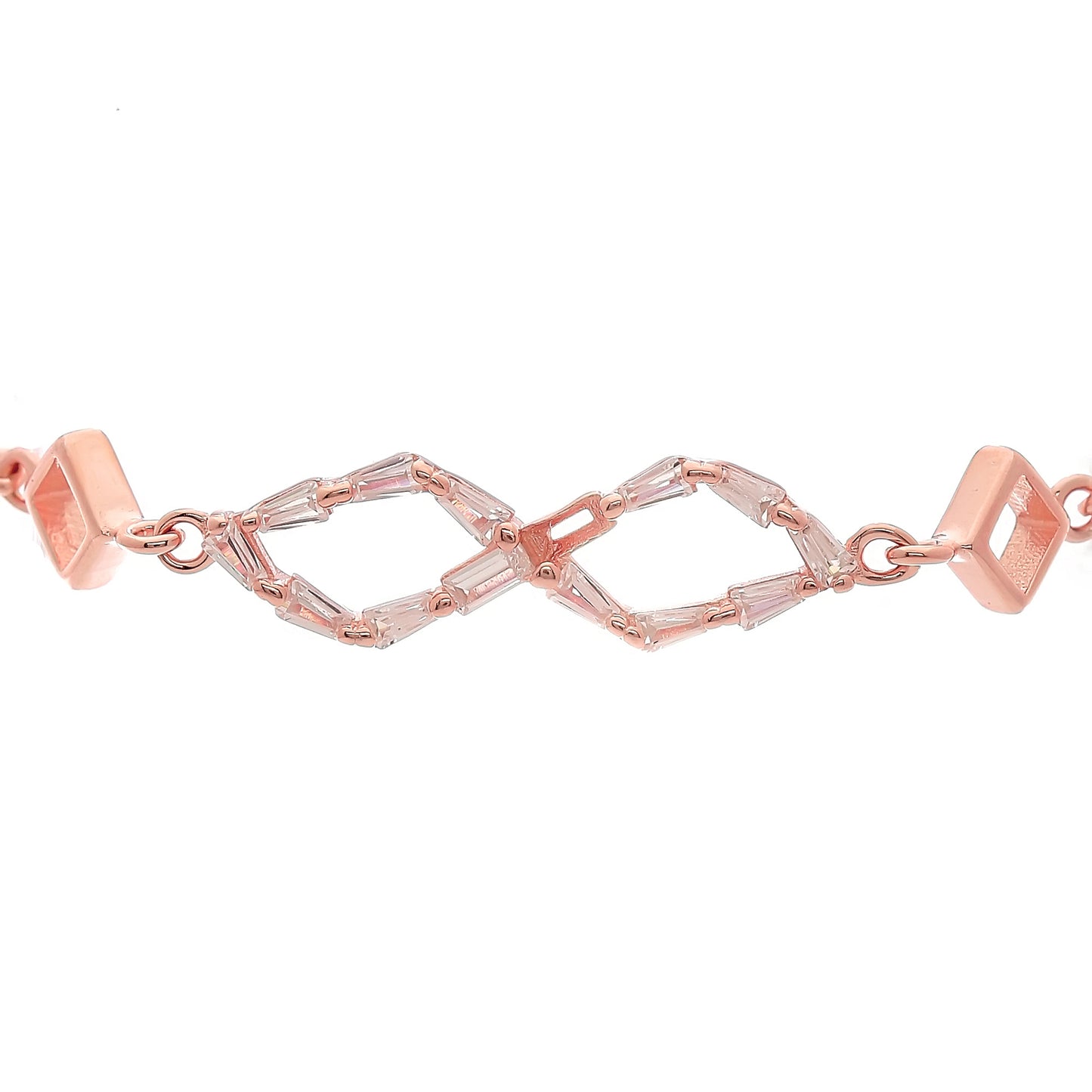 A rose-gold bracelet centred with a pair of crystal-framed motifs, anchored by two small diamond-like stones at the sides. The layout forms a clear front line without crowding the chain. A neat, structured piece suited for everyday use or light gifting.