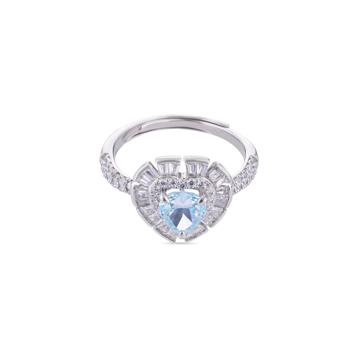 A heart-cut aqua blue stone set in 925 sterling silver, framed by clear stones arranged in a radiant sunburst design. Romantic in spirit yet composed in proportion, the piece carries a quiet, luminous presence on the hand.