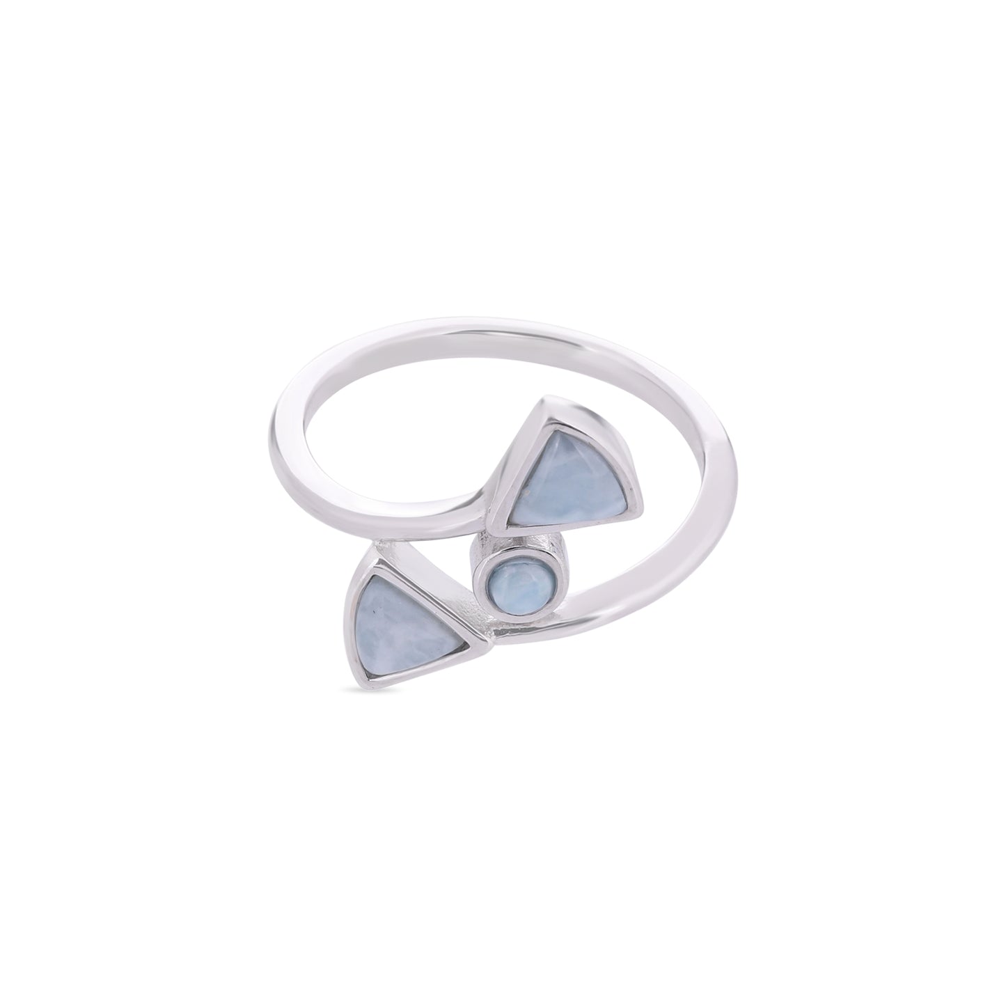 A sleek silver open ring featuring two soft blue triangular stones and one small circular stone. At the center the polished metal frame contrasts gently with the cool smooth stone.