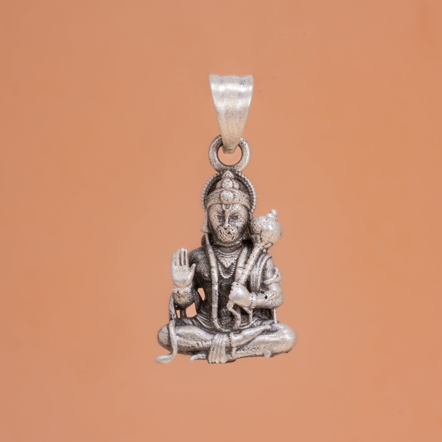 A detailed silver pendant featuring Hanuman in a calm, seated posture. Strong lines and an oxidised finish give it a grounded, protective presence. A steady piece for men who like their jewellery to hold meaning, not noise.