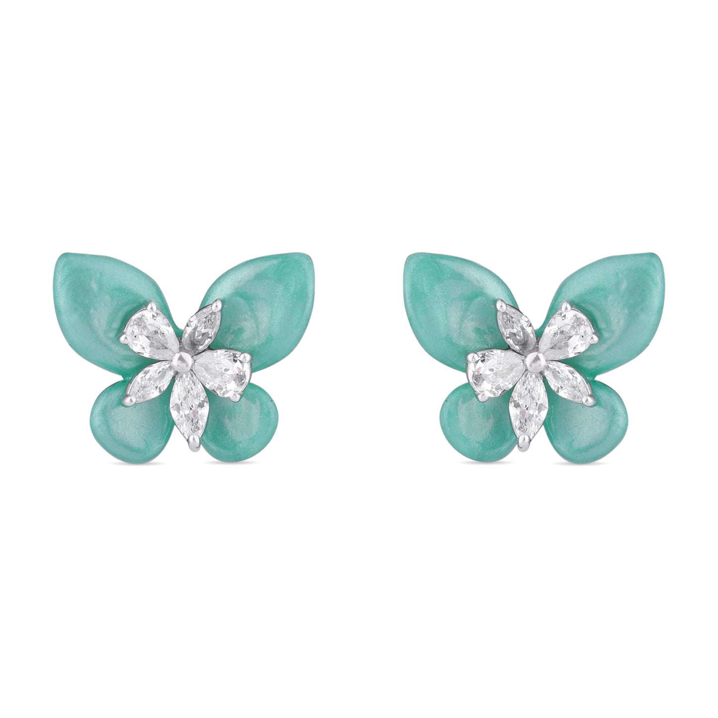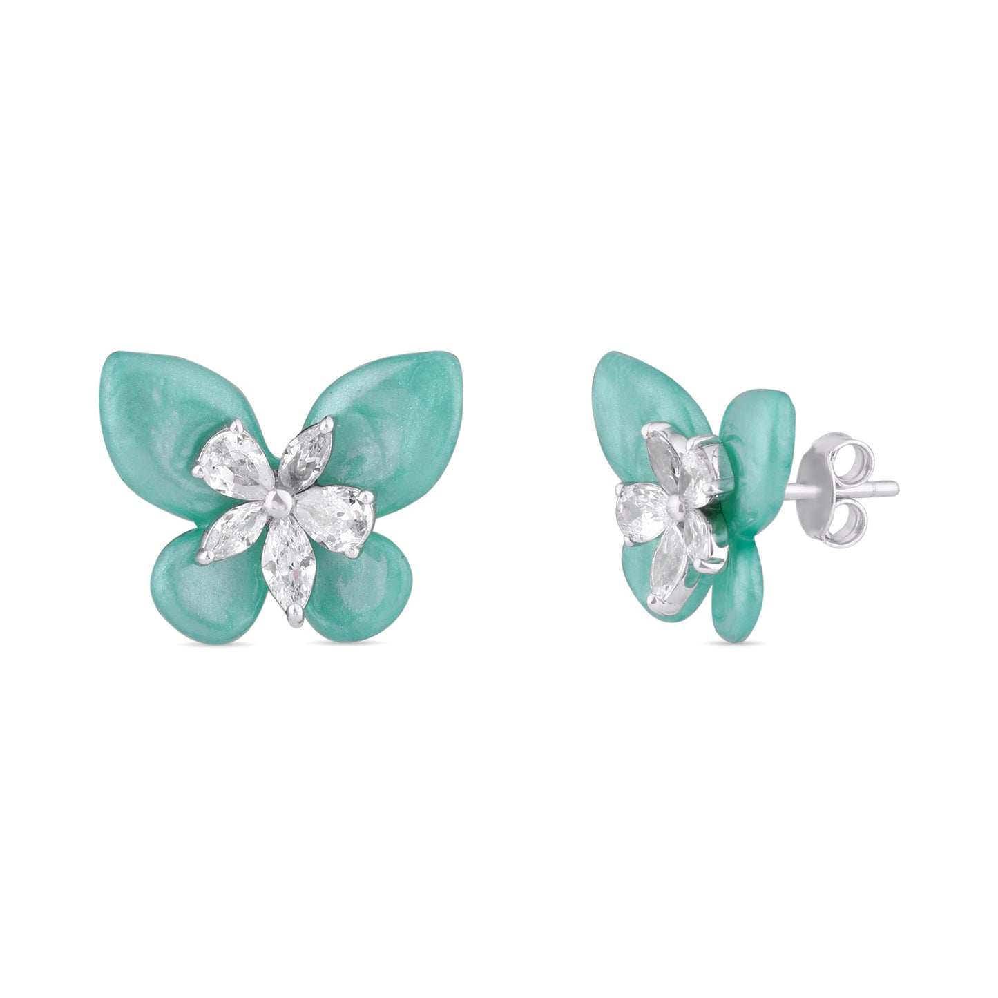 Delicate studs featuring turquoise enamel petals with a sparkling cluster of clear. Stones at the center the compact butterfly form blends smooth color with faceted brilliance.