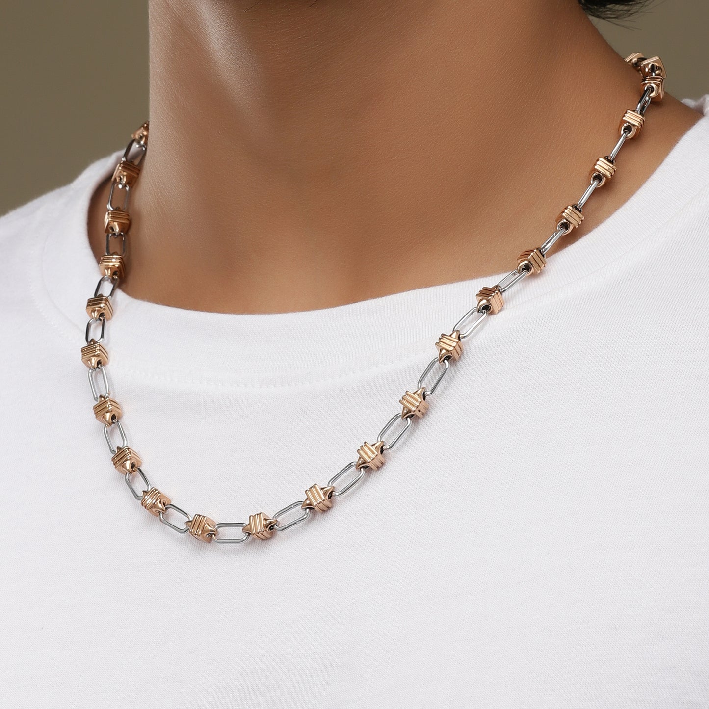 A silver chain built with elongated links wrapped in warm rose-toned accents. Textured, balanced, and designed for everyday rotation.